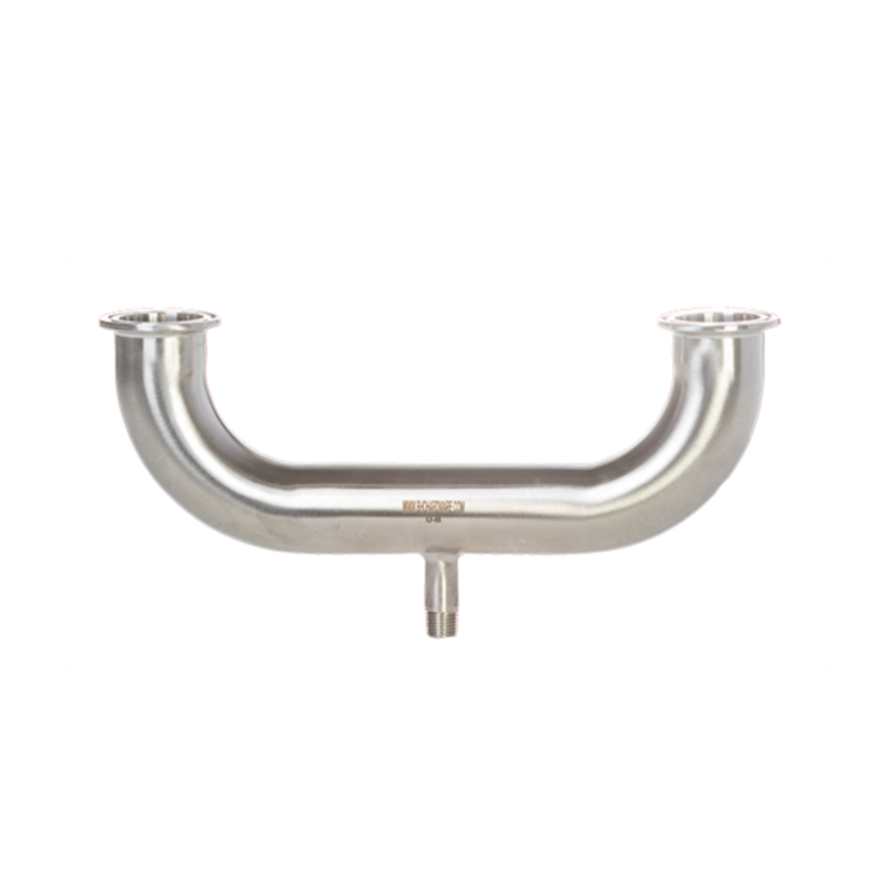 The U-Bend 90 Degree 1.5" Tri-Clamp Adapter is designed to easily connect two ferrule spool or processing lines while providing an additional central port for pressure monitoring or drainage. Constructed from durable 304 stainless steel, this adapter features two 1.5" tri-clamp connections and a ¼" male NPT port centered at the bottom of the U-bend. Gaskets and clamps (sold separately) are required for sealing.