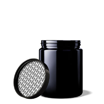 Its wide opening makes it easy for packing ingredients as well as to providing easy access the product for use. Although it has a wide mouth opening, the 150 ml Saturn has a standard 53/400 thread. This round jar pairs perfectly with our classic black lids, as it aligns with the body of the jar for a strong, modern look.