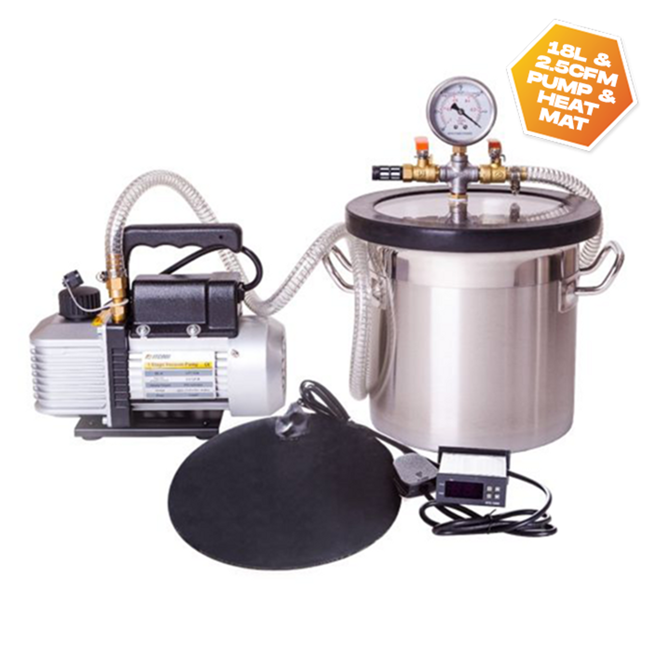 The Forge Vacuum Chamber Pro Kits are premium degassing solutions designed for professionals in botanical processing, resin casting, and laboratory work. Made from robust 304 stainless steel and now featuring a complete setup—including a high-performance vacuum pump and a precision-controlled heat mat—this kit is ready to deliver reliable, repeatable results straight out of the box.